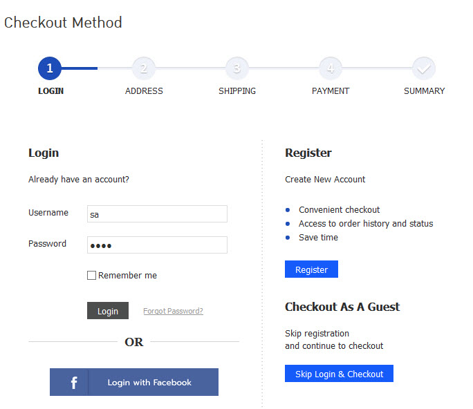 3. If you click 'Checkout' button, you will see login page. To verify the user ID and password for a member, or register new account or checkout as a guest (skip registration and continue to checkout)